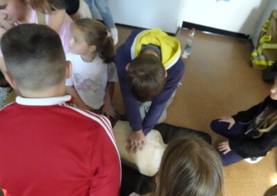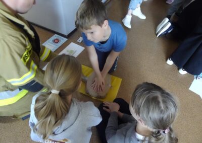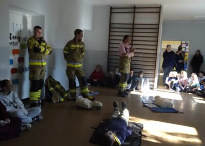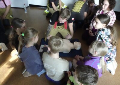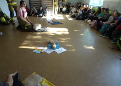 Podczas akcji uczniowie, pod okiem nauczycieli i druhów z Ochotniczej Straży Pożarnej, ćwiczyli udzielanie pierwszej pomocy, w tym resuscytację krążeniowo-oddechową (RKO) na fantomach. Dzieci z ogromnym zaangażowaniem uczyły się, jak prawidłowo reagować w sytuacjach zagrożenia życia i jak wezwać pomoc.