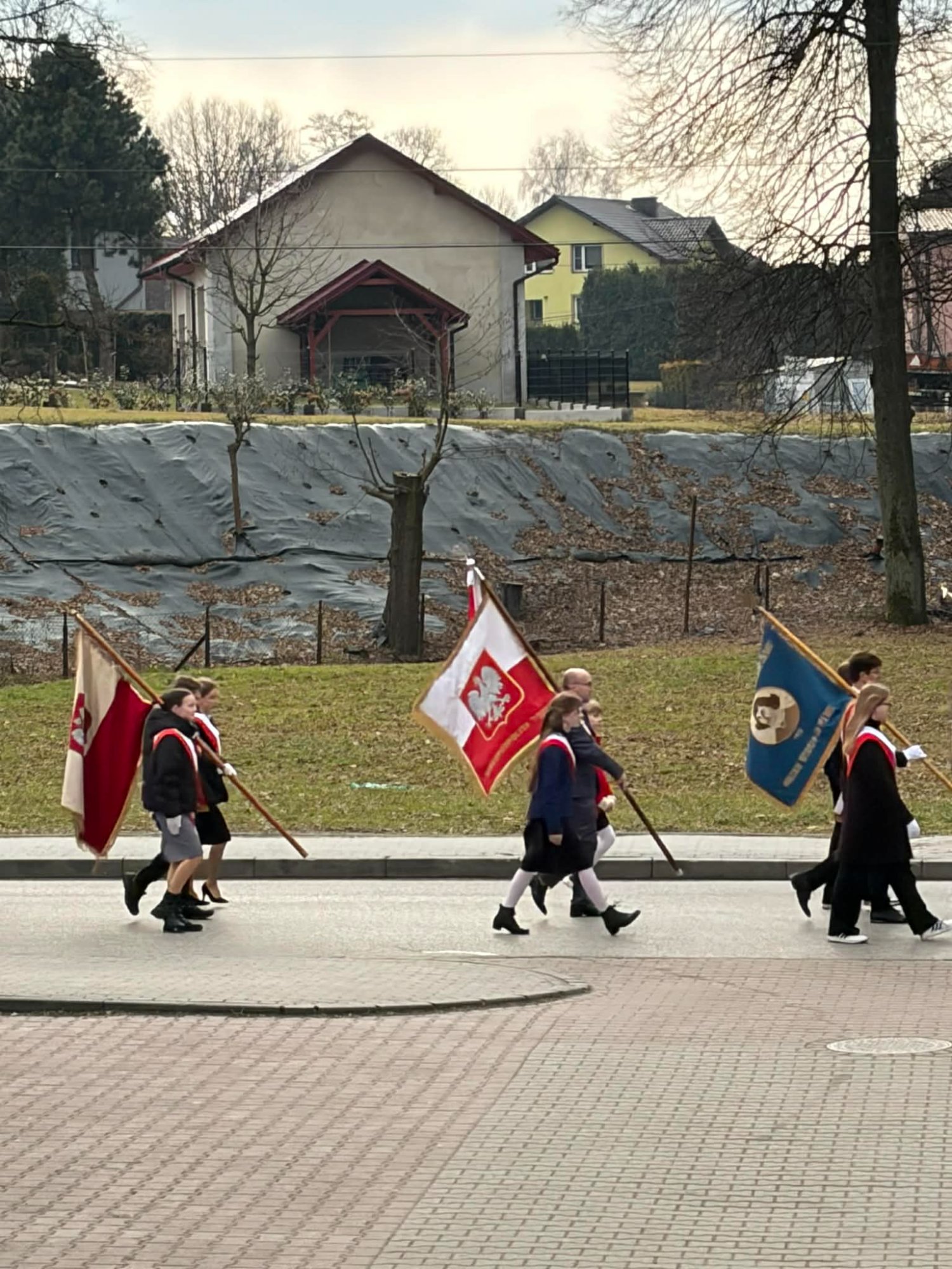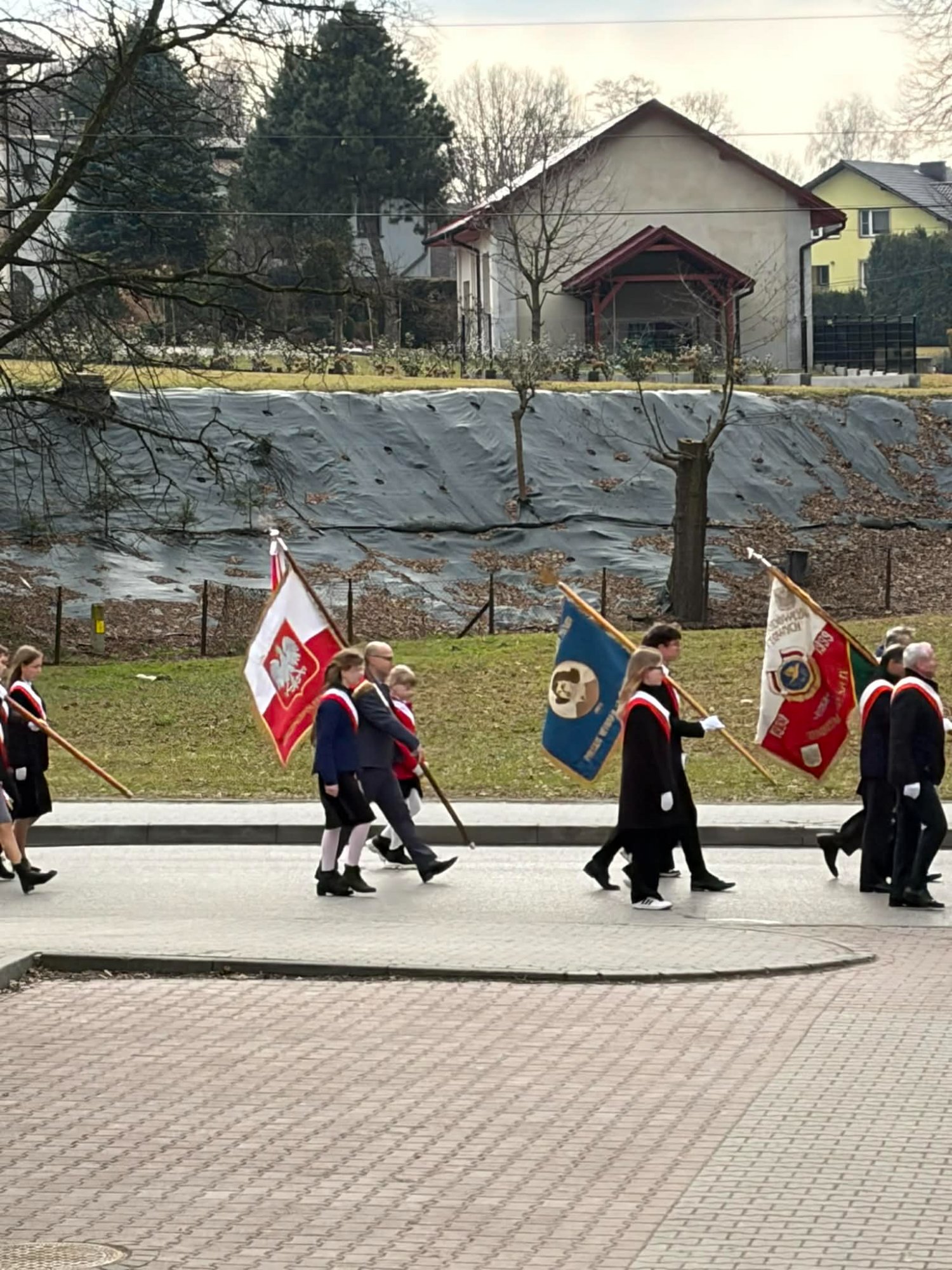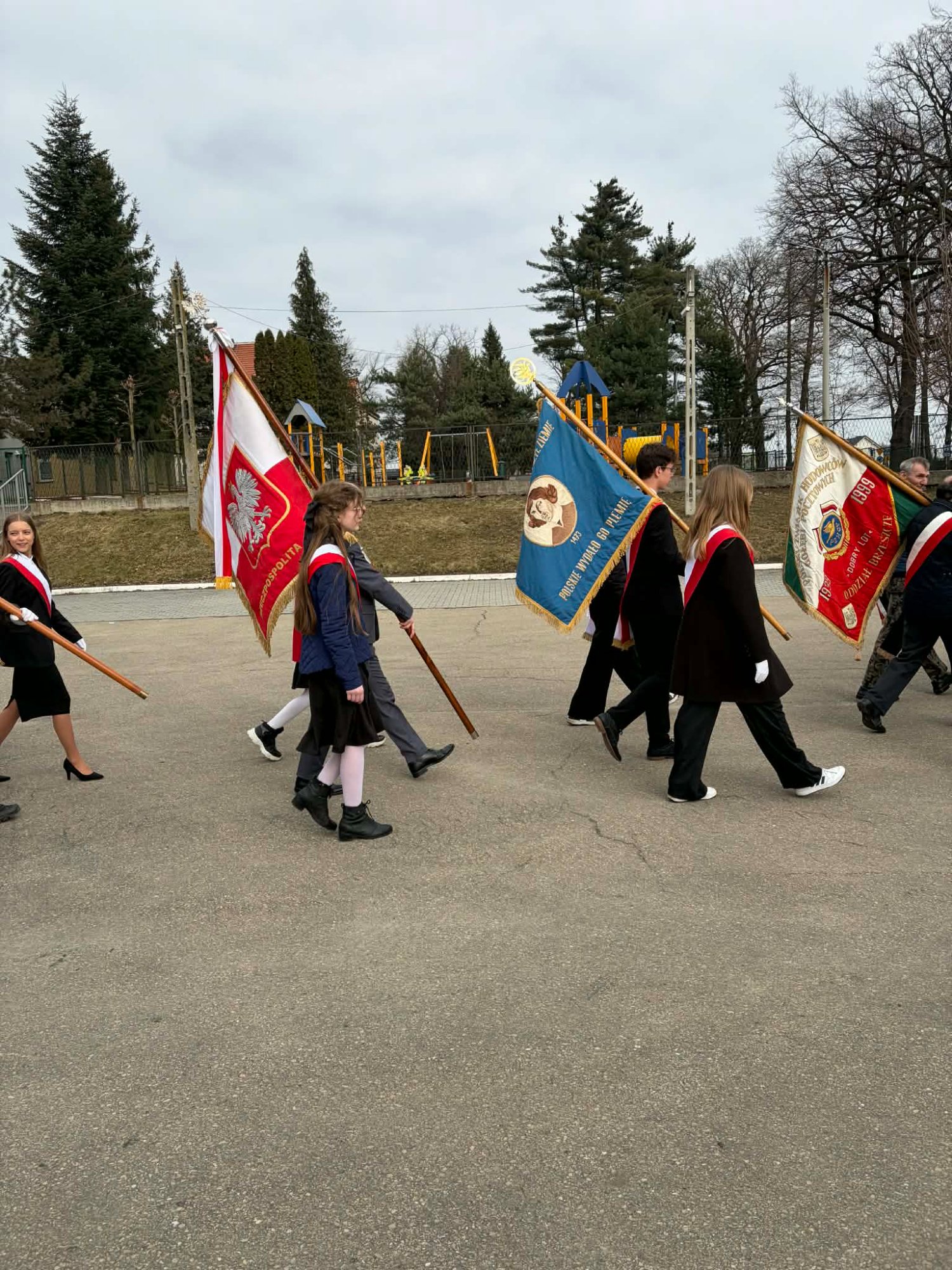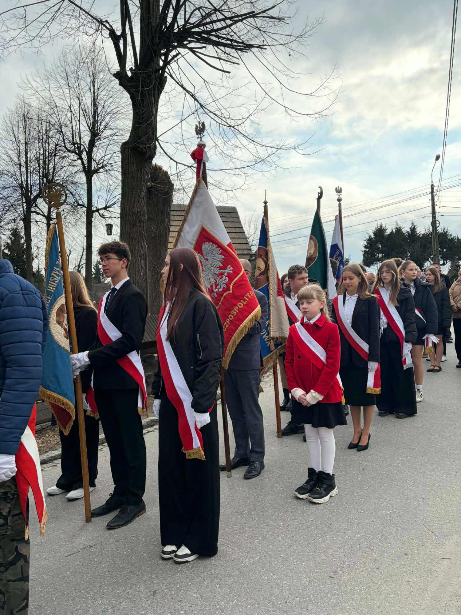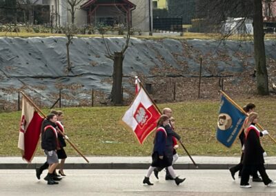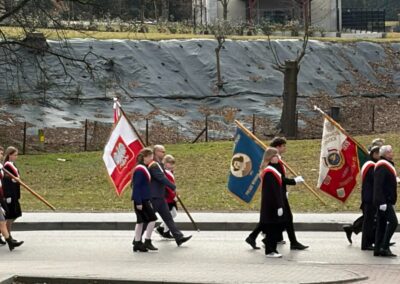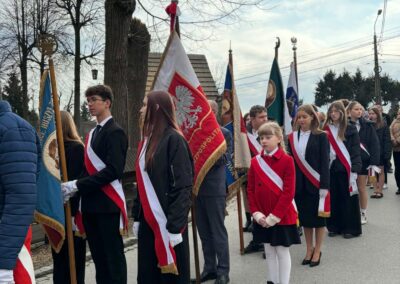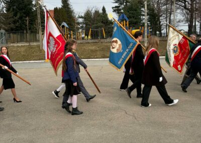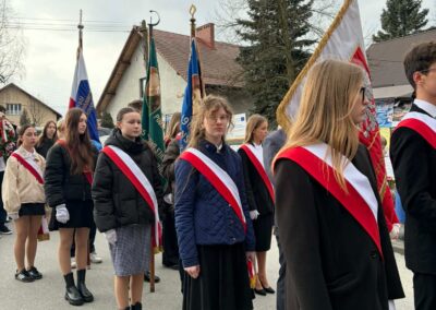 Naszą szkołę z dumą reprezentował poczet sztandarowy wraz z opiekunami. Uczniowie w galowych strojach godnie uczestniczyli w obchodach, podkreślając wagę tego patriotycznego wydarzenia.