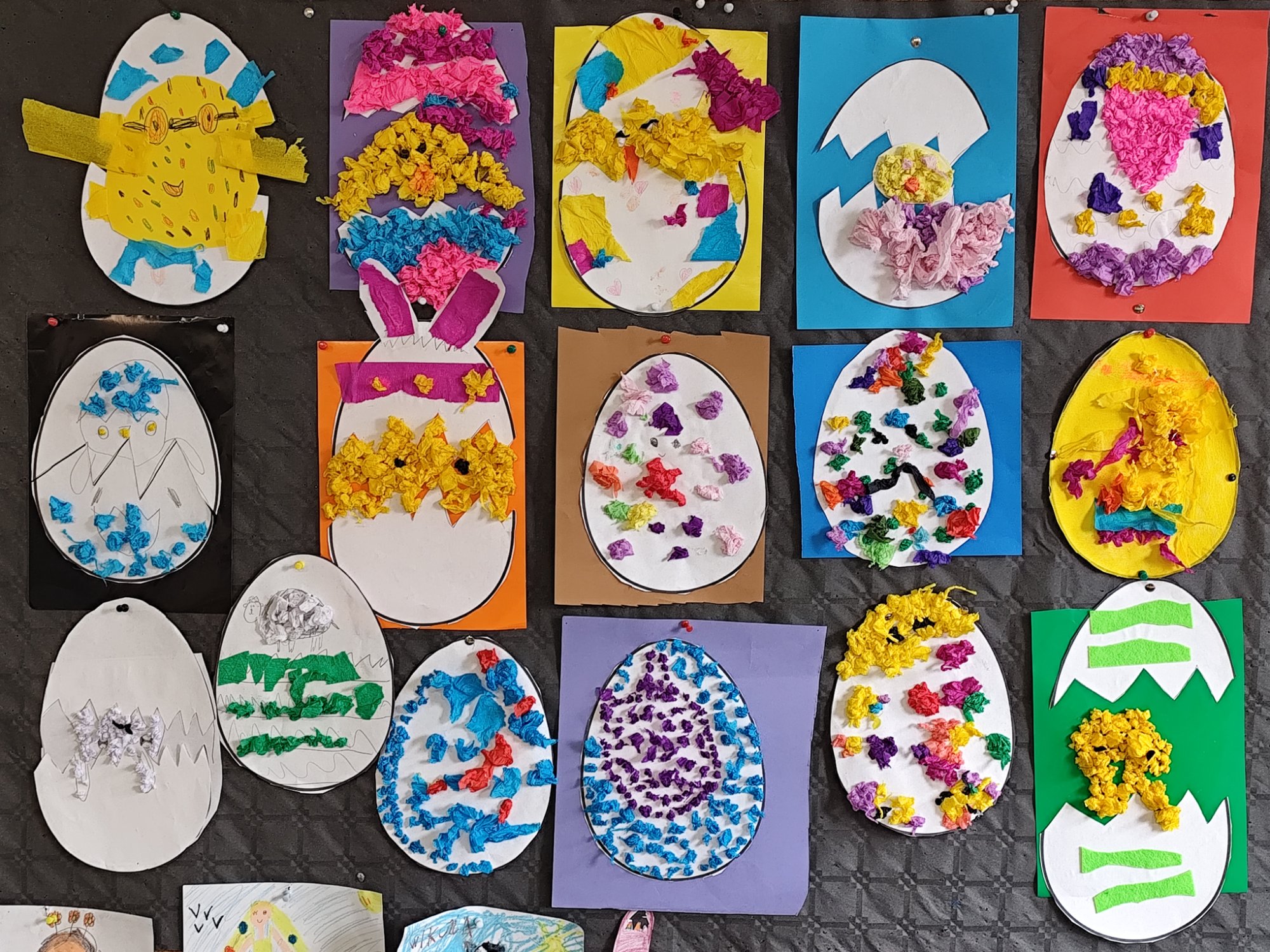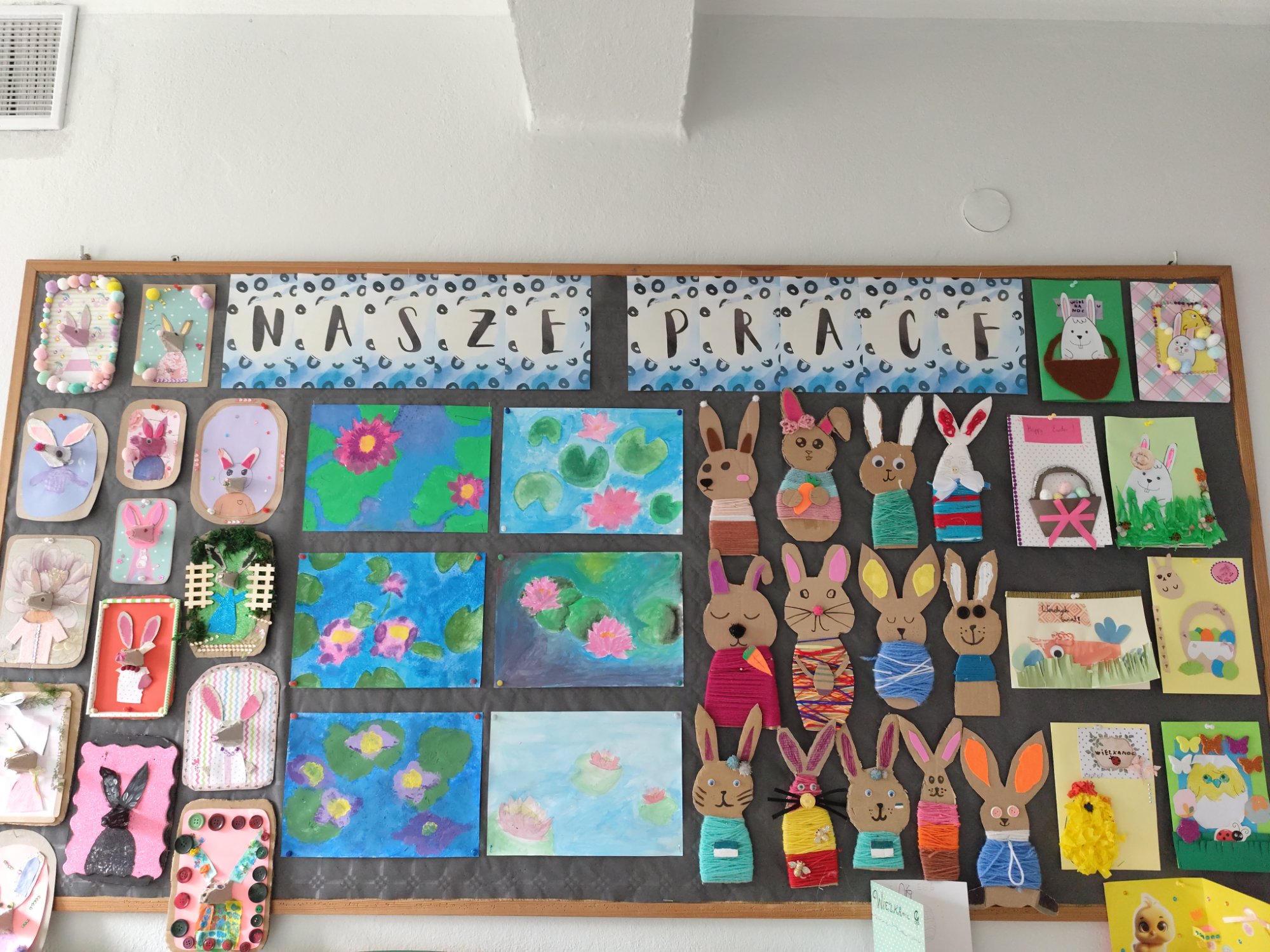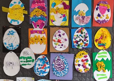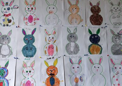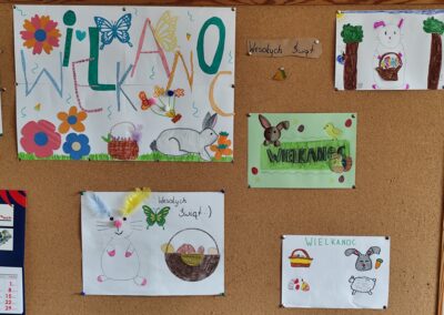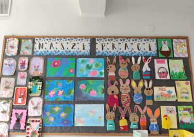 Kolorowe pisanki, wiosenne kwiaty, zajączki oraz różnorodne ozdoby wykonane własnoręcznie przez uczniów pojawiły się na korytarzach i w salach lekcyjnych, nadając szkolnym murom ciepły, wielkanocny klimat. Kreatywność i staranność dzieci sprawiły, że każdy zakątek szkoły stał się pełen barw i świątecznej radości.