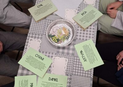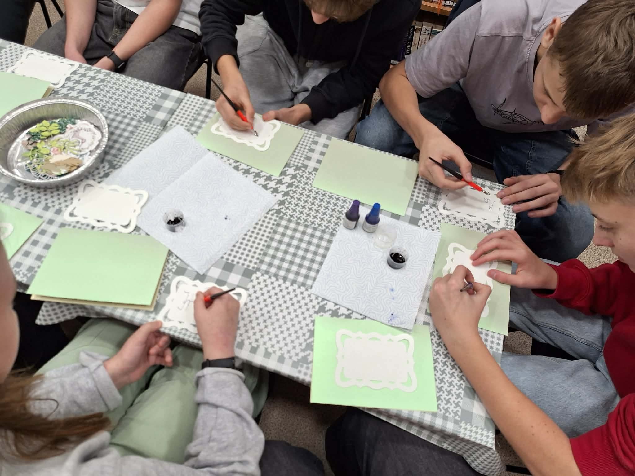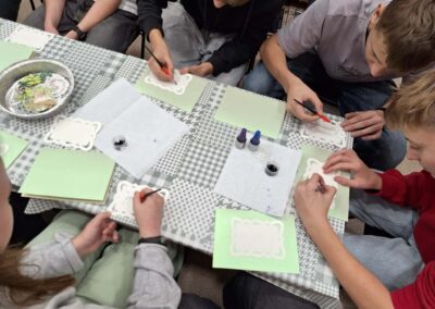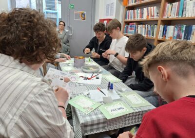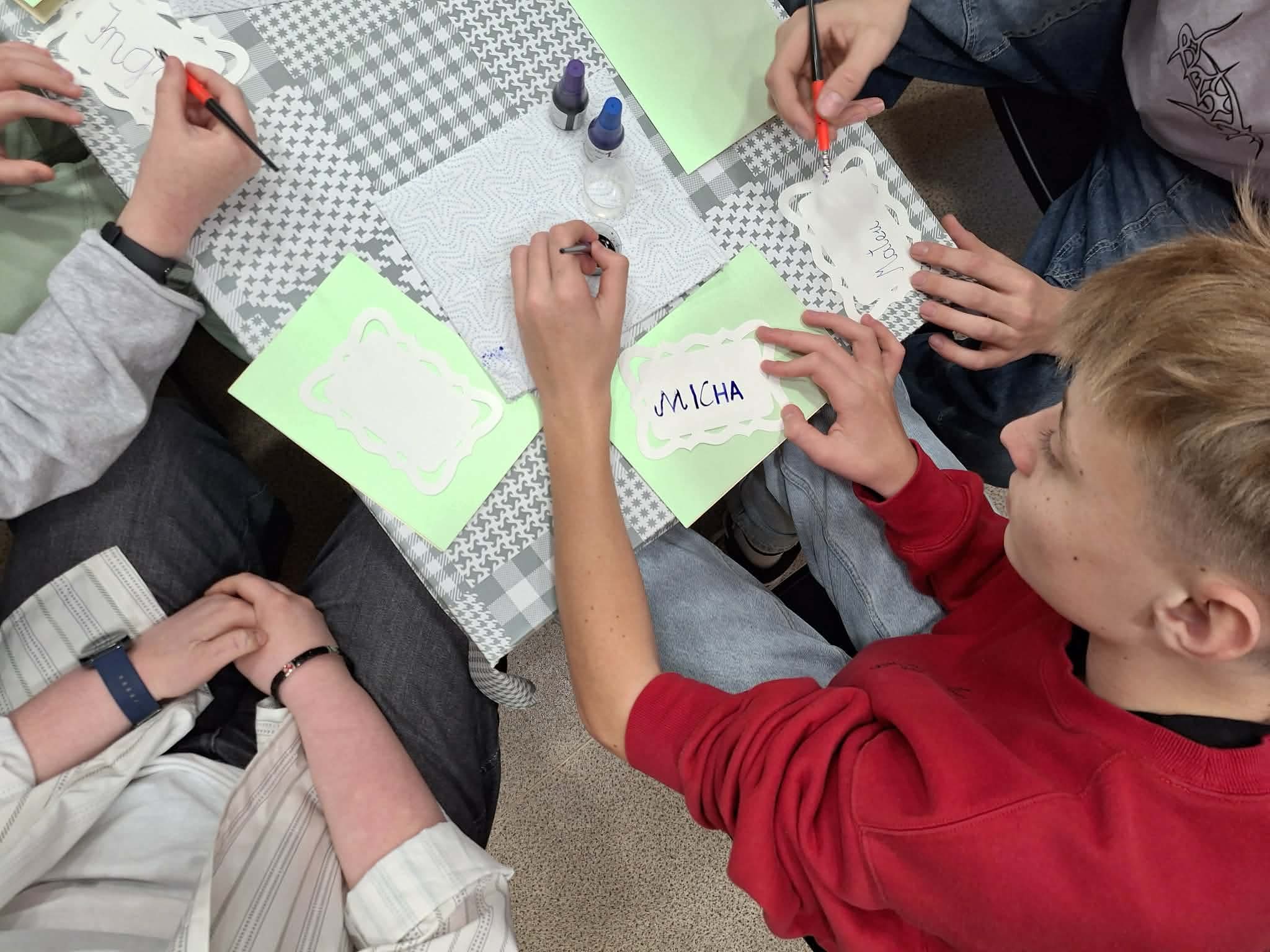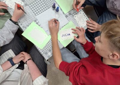 W dalszej części zajęć uczestnicy wcielili się w rolę dawnych skrybów. Każdy z nich miał okazję spróbować swoich sił w kaligrafii – starannym i ozdobnym zapisie imion. Młodzież z dużym zaangażowaniem tworzyła piękne, artystyczne napisy, ozdabiając je według własnych pomysłów.